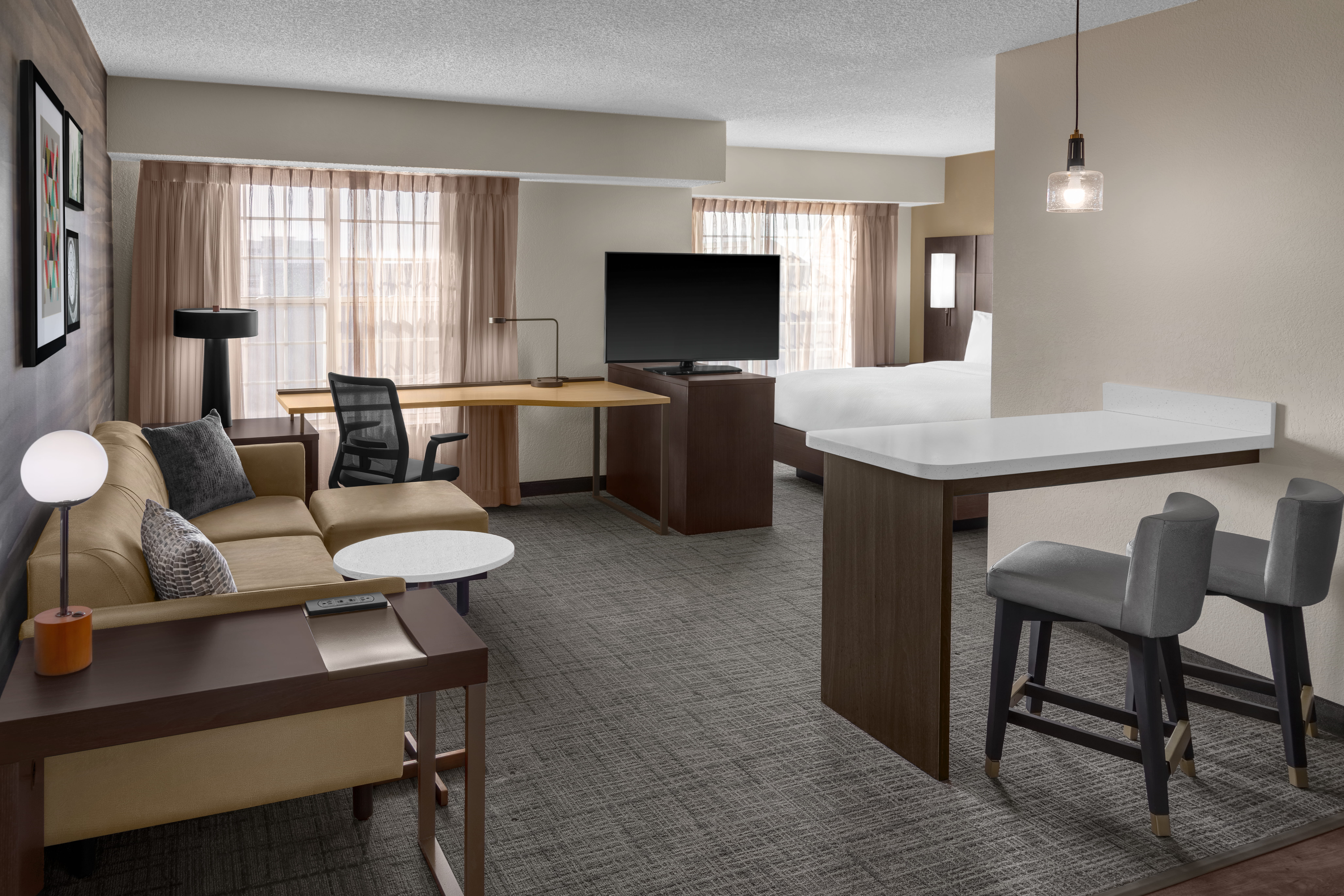 The redesigned studio, one-bedroom, and two-bedroom suites average 636 square feet and feature full-size kitchens with residential appliances, separate living and sleeping areas, and dedicated workspaces. Updated finishes introduce a modern, comfortable aesthetic with a color palette of grey, blue, and brown, creating a calm and inviting residential environment.