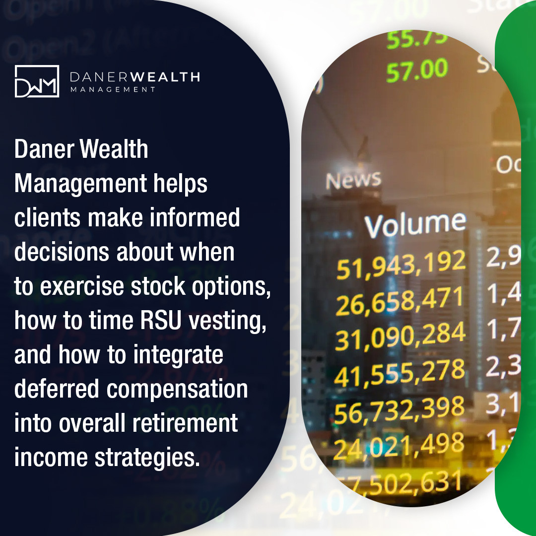 Daner Wealth Management helps clients make decisions about when to exercise stock options, how to time RSU vesting, and how to integrate deferred compensation into overall retirement income strategies. These services are especially relevant for high-level professionals in Alpharetta, GA, such as those in tech, finance, and sales, due to the complexity of equity-based compensation.